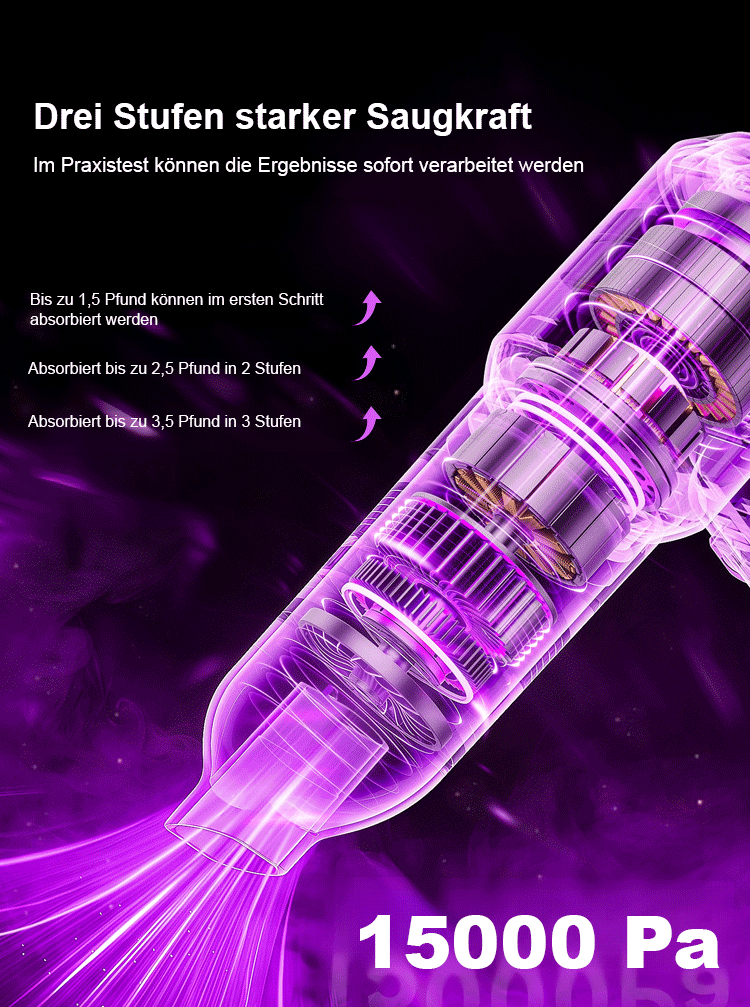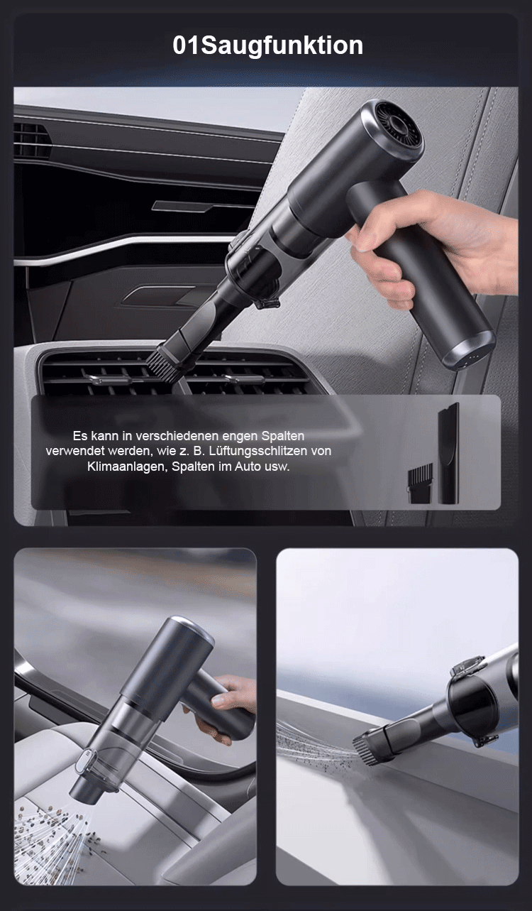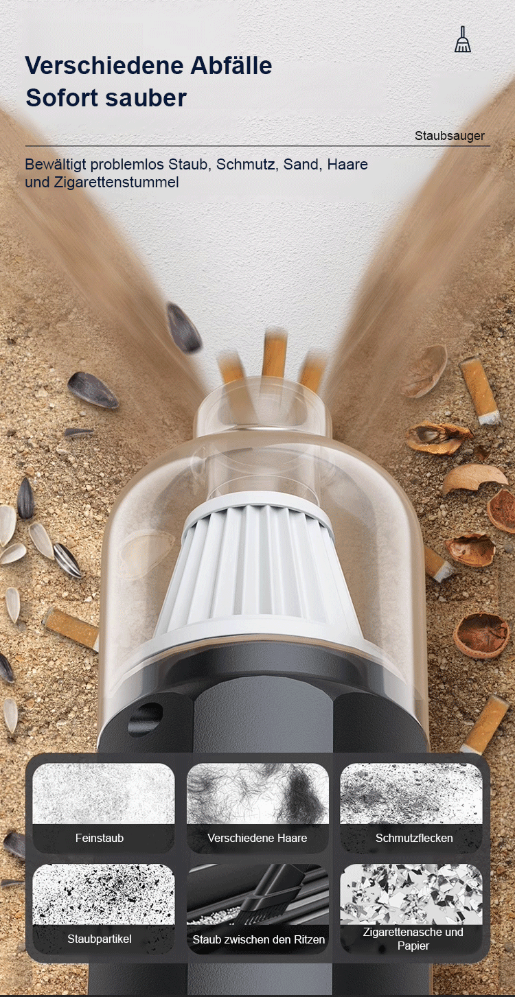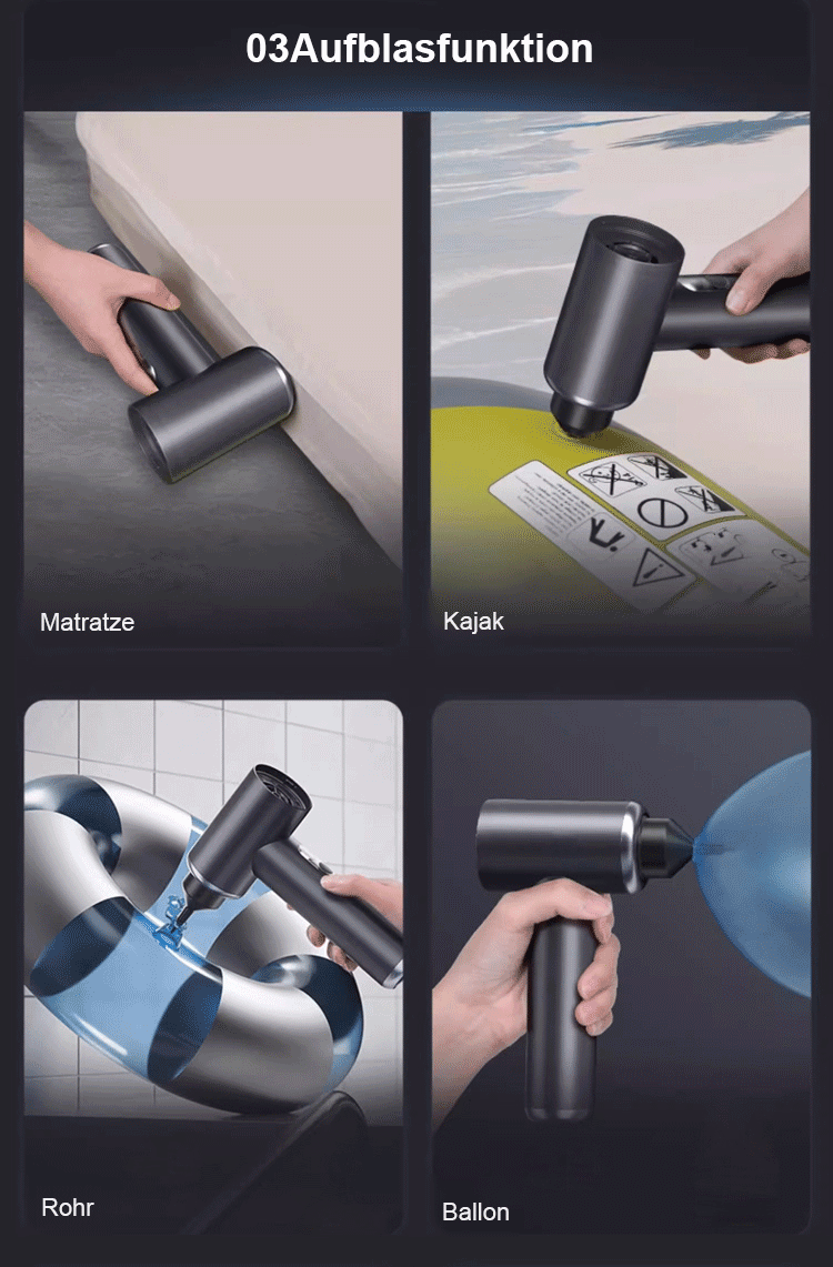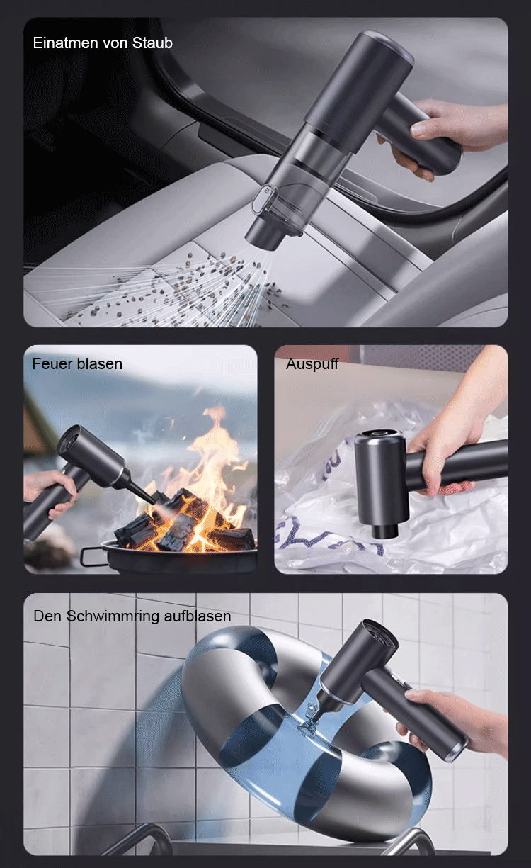Die Saugleistung erreicht erstaunliche 15.000 Pa, das ist das Zehnfache eines normalen Auto-Staubsaugers! Es kann nicht nur Staub saugen, sondern auch hartnäckigen Schmutz wegblasen, Vakuum für Lebensmittelbeutel erzeugen und sogar einen Fußball aufpumpen!