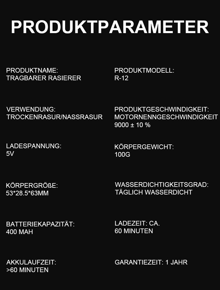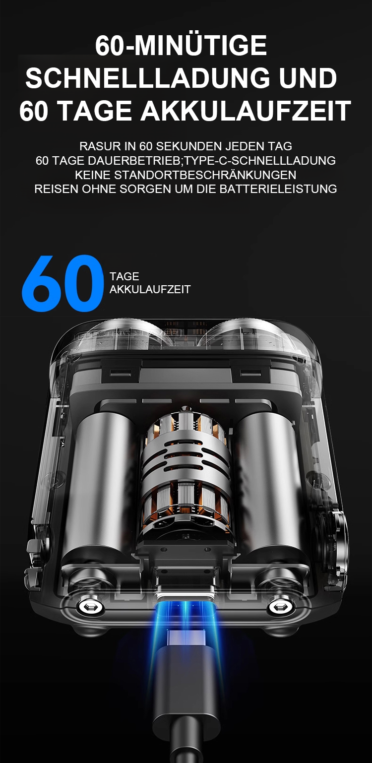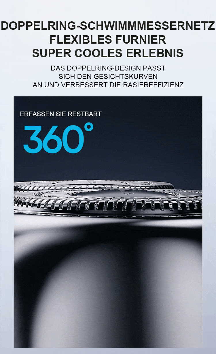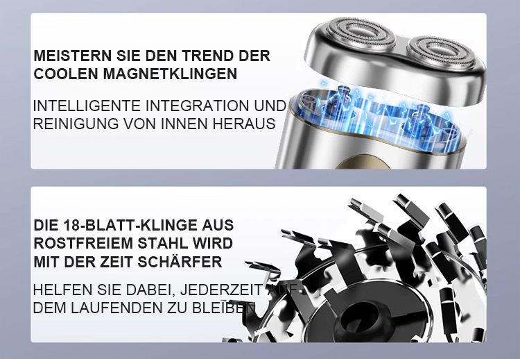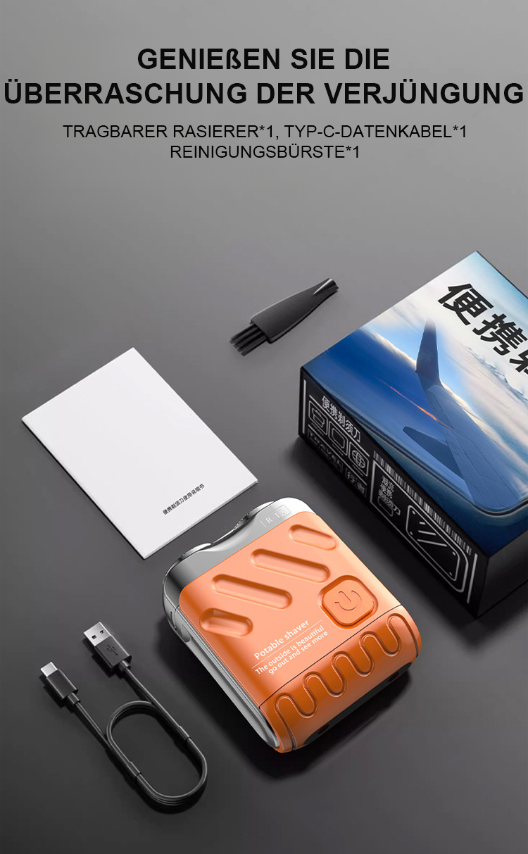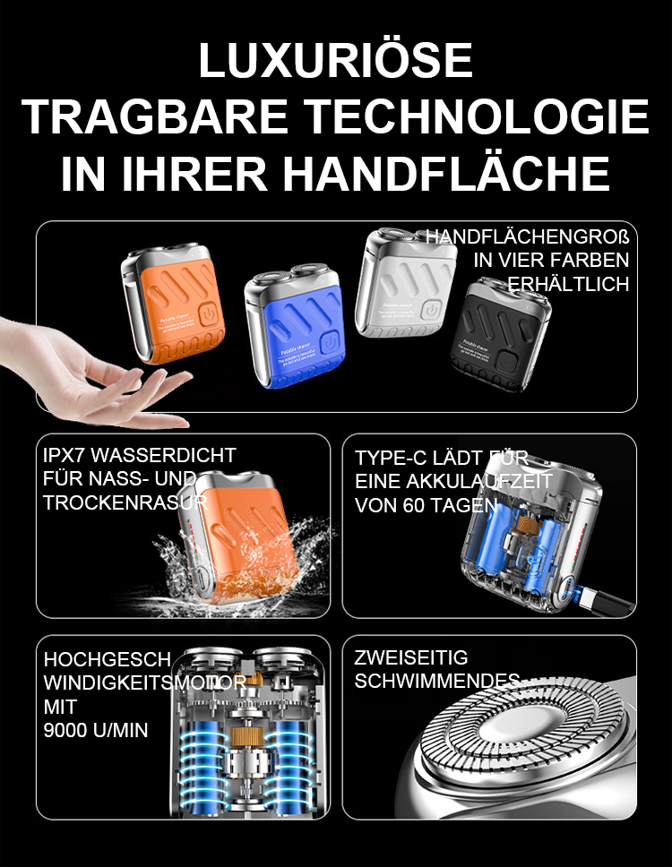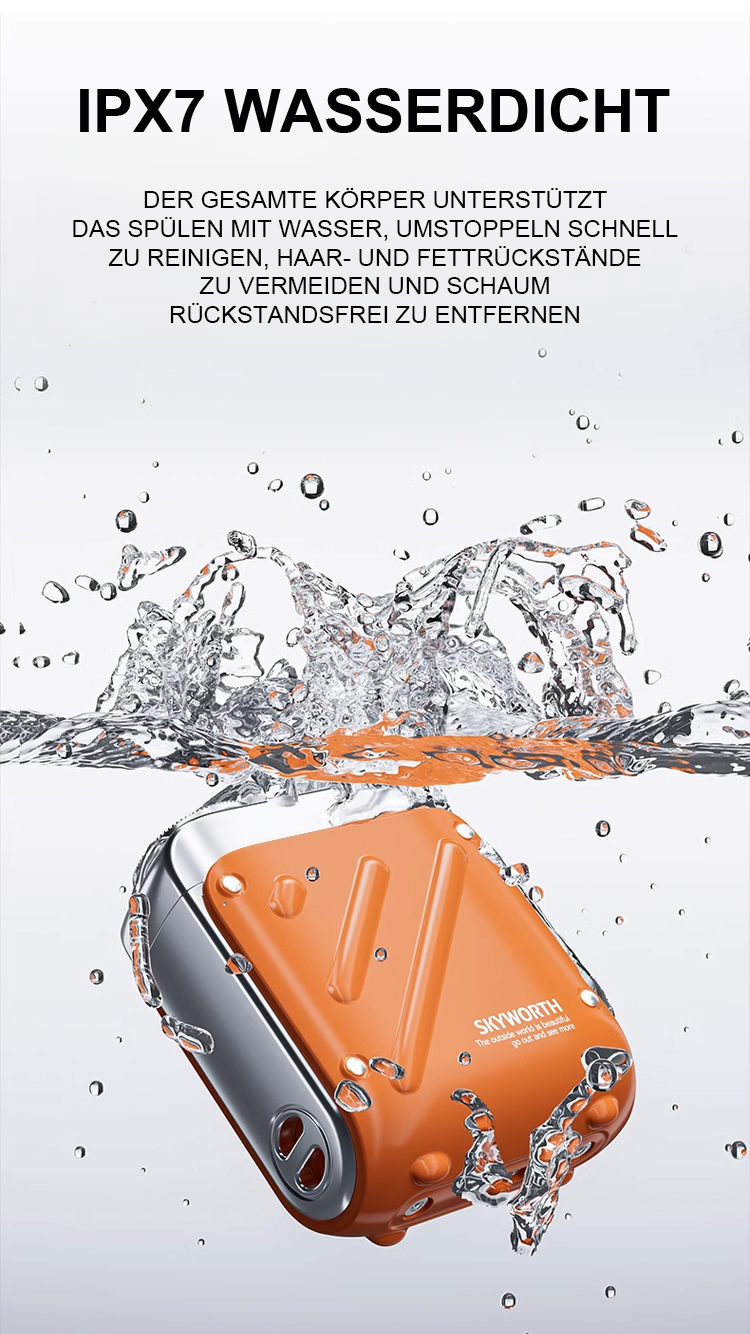 Egal wie hart die Bartstoppeln sind, sie können mühelos glatt rasiert werden, ohne schwarze Punkte zu hinterlassen. Die Rasur passt sich perfekt dem Gesicht an, ohne die Haut zu verletzen. Mit der IPX7-Wasserdichtigkeit kann das Gerät einfach unter Wasser abgespült und wie neu gehalten werden. Kompakt und tragbar, es ist nicht größer als ein Kopfhörergehäuse und kann auf Geschäftsreisen oder im Urlaub mitgenommen werden!