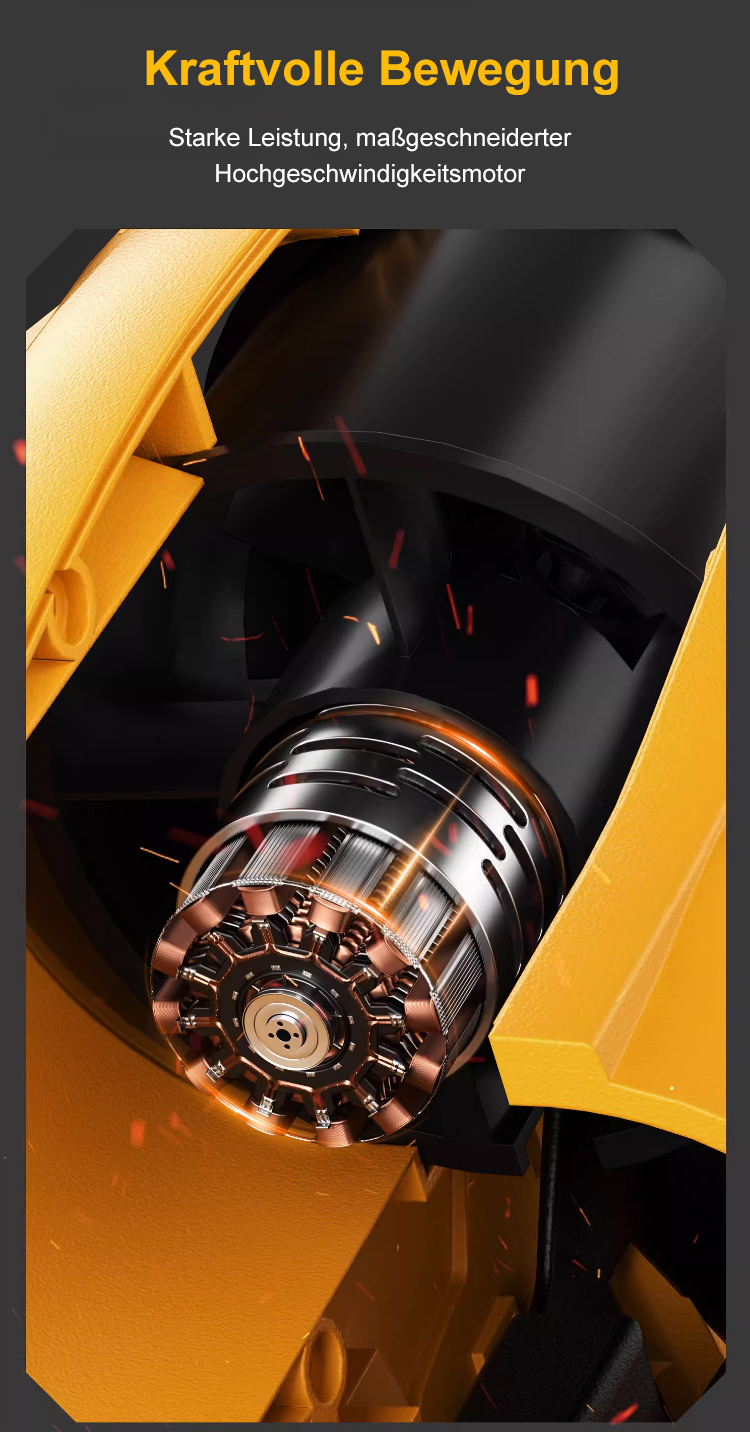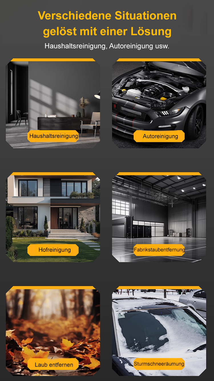 3 Minuten, um Staub aus den Autospalten zu entfernen, 5 Minuten, um Laub vom Rasen zu fegen, 7 Minuten, um Metallsplitter in der Werkstatt zu beseitigen!