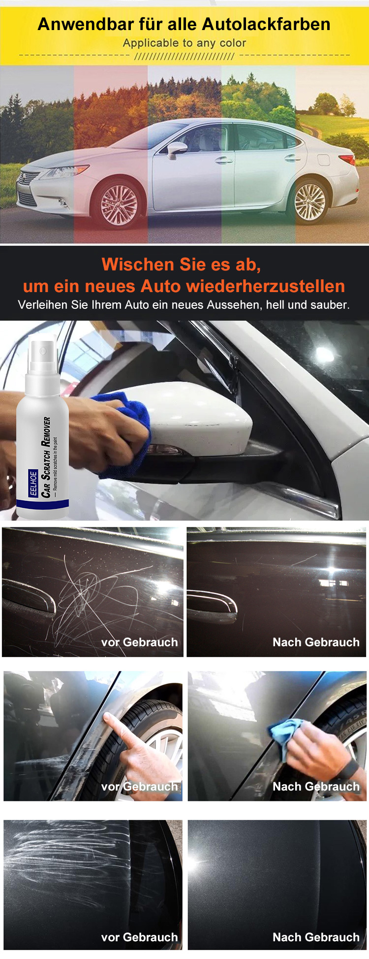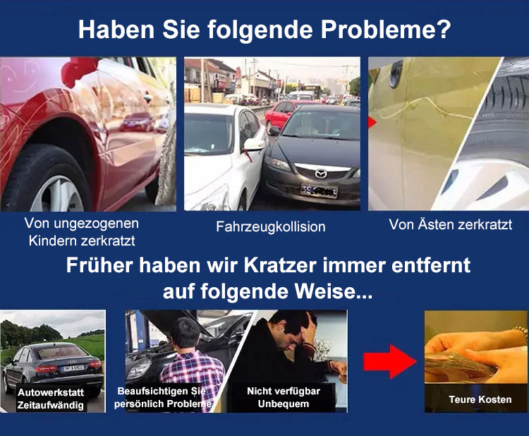 Verschwenden Sie kein Geld mehr beim Autohaus! Mit diesem Produkt können Sie Kratzer in nur drei Minuten problemlos reparieren, ohne Farbunterschiede. Sie sparen jährlich Tausende Euro an Reparaturkosten und können es für jede Farbe und jedes Fahrzeugmodell verwenden!